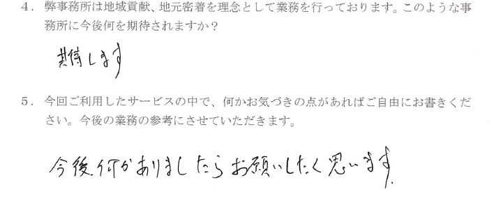 当事務所の相続税申告業務や相続遺産整理業務のサービスをご利用いただいたお客様には、業務終了後アンケートをお願いしています。頂いたお客様の声の一部をご紹介します。
